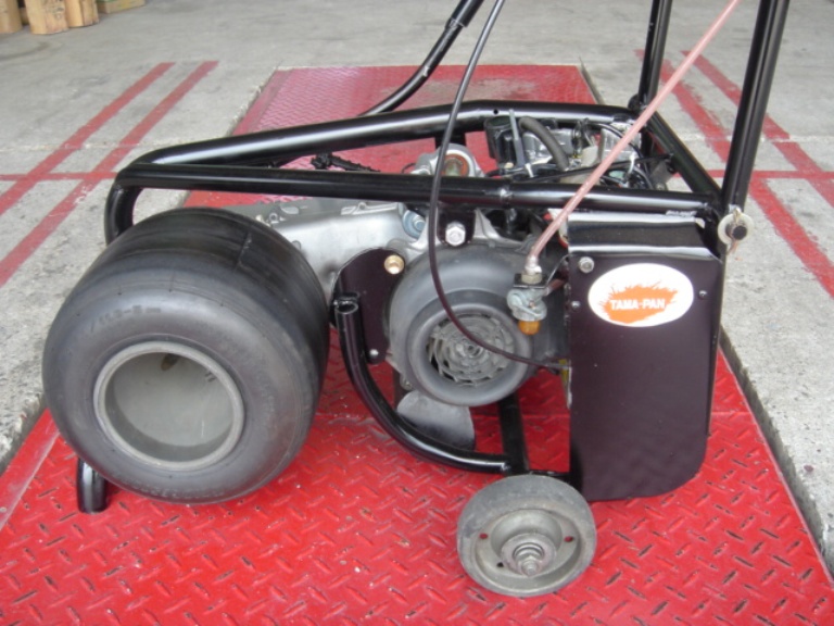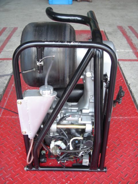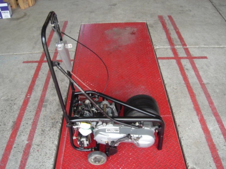 | タイヤは、レーシングカートのフロントを流用。 (知人から頂きました。ホイルはマグです。) バッテリー装備で、セルスタートできます。キックもOK フレームは、知り合いの車屋さんにて製作してもらいました。 |